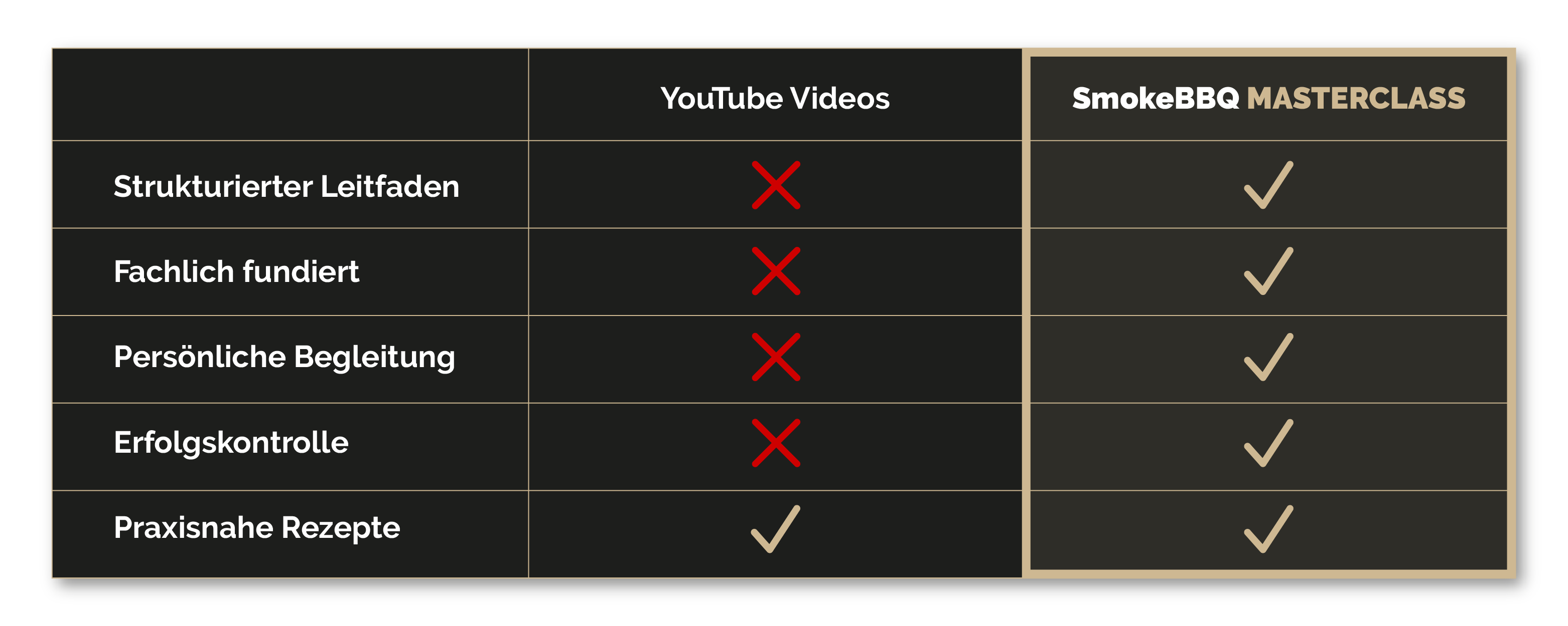Mit der Smoke BBQ Masterclass bekommst du das komplette Profi-Wissen für einen Bruchteil des Preises, kannst jedes Modul beliebig oft wiederholen und sparst dir teure Fehlversuche und Fleischverschwendung. Ein Live BBQ Workshop vor Ort kostet oft ein vielfaches.